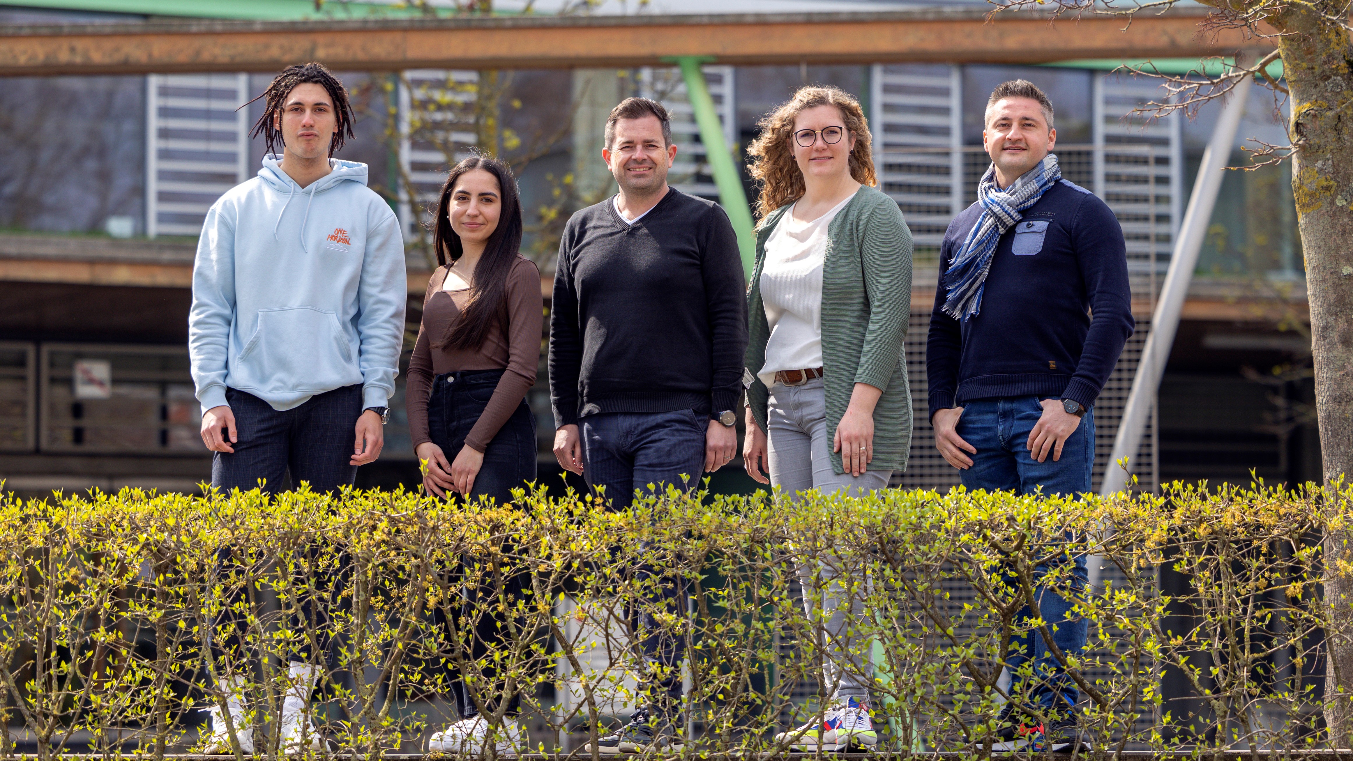 Das Foto (vom 04.04.2022) zeigt von li. nach re. den stellvertrenden Schülersprecher Stefan Slavov (11/3), die Schülersprecherin Suna Sünbül (JS2d) und die Verbindungslehrkräfte Oliver Schilke, Manuela Sahner und Otto Adolf.