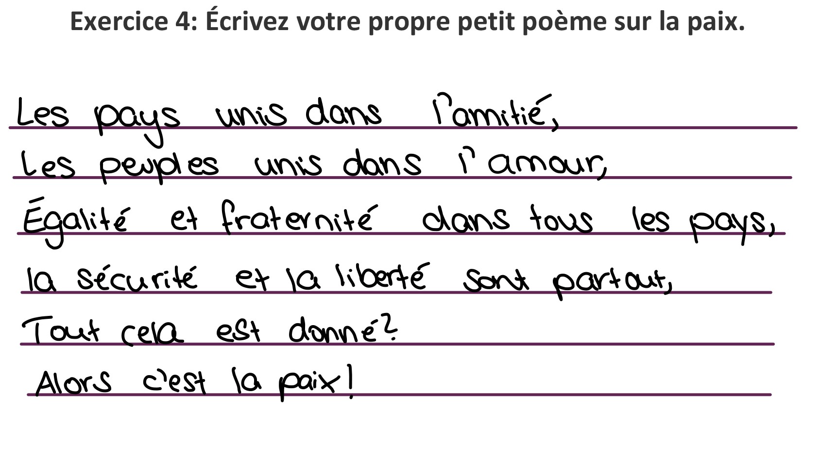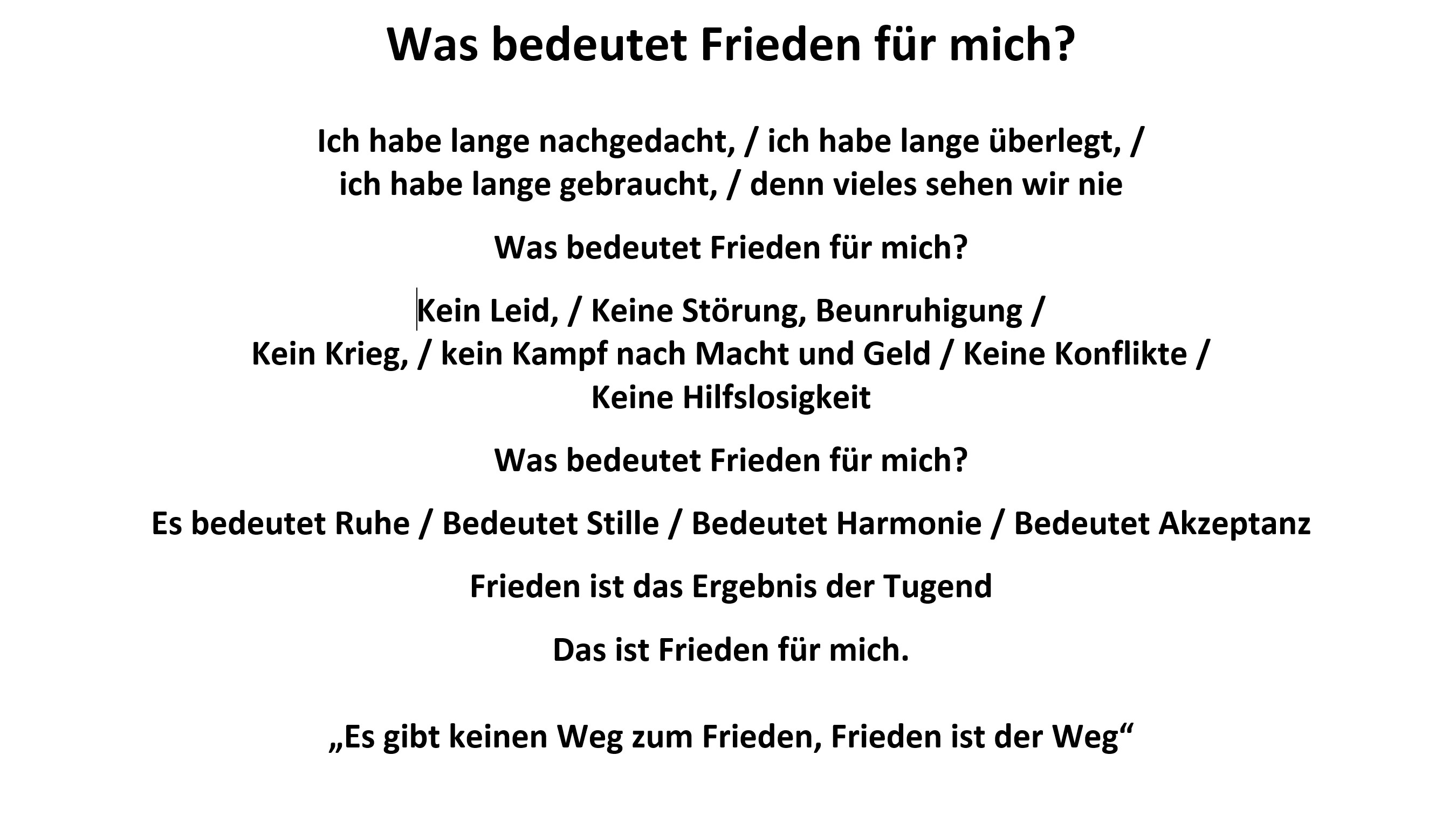 Im Rahmen des Französisch- und Ethikunterrichts haben sich Schülerinnen und Schüler mit dem Thema "Frieden" auseinandergesetzt und ihre Gedanken in Form von Gedichten, Poetry Slams und Zeichnungen zum Ausdruck gebracht. Das Thema "Frieden" ist nicht nur in diesen aufwühlenden Zeiten wichtig, sondern sollte immer als ein Prozess verstanden werden, an dem wir alle tagtäglich beteiligt sind und schon im Kleinen etwas Großes schaffen können. Ein großes Lob an unsere Schülerinnen und Schüler, die sich mit dieser Thematik sehr differenziert beschäftigt haben.