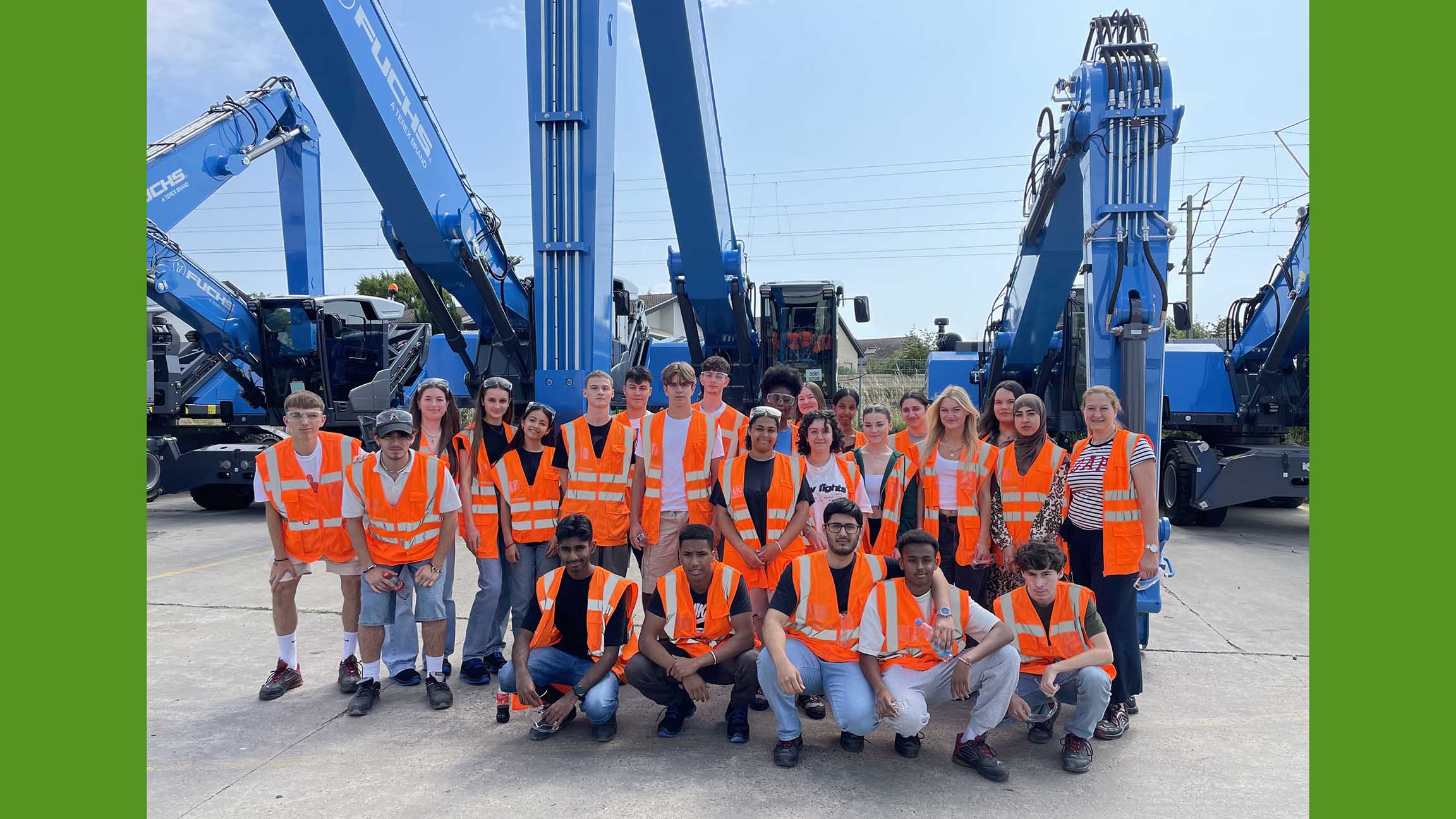 Am 17.07.2023 stand für die Klasse 11/5 eine Werksbesichtigung bei der Firma Terex Fuchs in Bad Schönborn auf dem Plan. Zunächst wurden die Geschäftsfelder und die Unternehmensstrategie des amerikanischen Konzerns vorgestellt. Nach einer Sicherheitsunterweisung ging es dann in die Produktionshalle, wo Begriffe aus dem Unterricht wie Kanban, just in time (JIT), just in sequence (JIS) sowie Werkstatt- und Fließfertigung ‚live‘ und in Farbe veranschaulicht werden konnten. Zwischen den imposanten Umschlagmaschinen, die dort für die Arbeit auf Schrottplätzen und den Warenumschlag in Häfen produziert werden, konnten viele Fragen beantwortet und sogar die eine oder andere Maschine bestiegen werden.