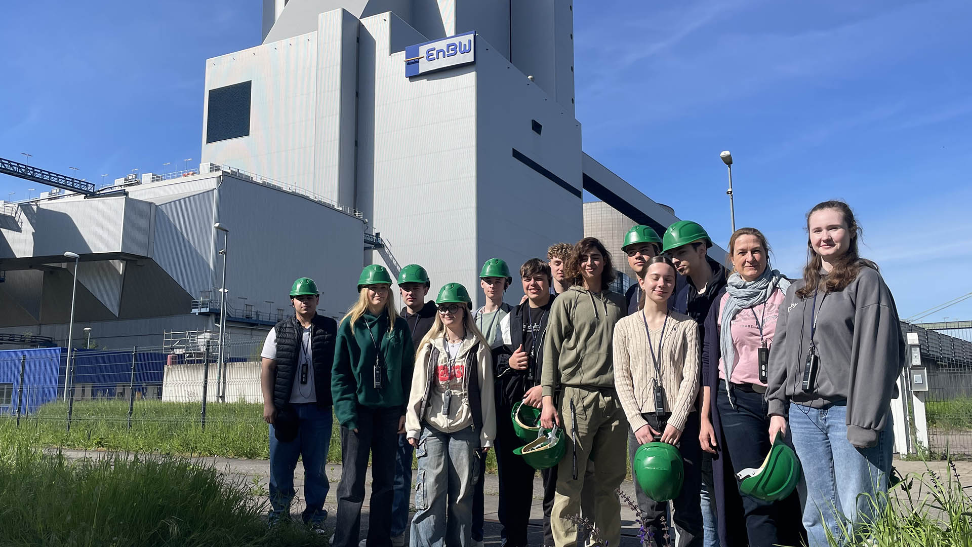 Am Freitag, den 12.4., haben wir uns an der Schule getroffen und sind gemeinsam in den Rheinhafen gefahren. Dort begann um 9.30 Uhr die Besichtigung bei der EnBW. Ein sehr netter Mann, der in seiner Freizeit solche Besichtigungen durchführt, hat uns dort begrüßt. Nach einer kurzen Erfrischung haben wir etwas über das Unternehmen und verschiedene Energiegewinnungsprozesse erfahren. Als dieser interessant gestaltete Vortrag zu Ende war, bekamen wir Helme und Kopfhörer und gingen in das Kraftwerk der riesengroßen Anlage. Dort haben wir viele Informationen zu den verschiedenen Ausbildungsangeboten der EnBW erhalten sowie einen Einblick in die Werkstatt. Auf dem Weg zum Kraftwerk 8 sahen wir riesige Kohlehaufen und einen Kohlebagger. Im Gebäude fuhren wir mit dem Fahrstuhl zunächst zur Steuerungszentrale und auf das Dach, wo wir in 120 m Höhe einen faszinierenden Ausblick über Karlsruhe und den Rheinhafen genießen konnten.