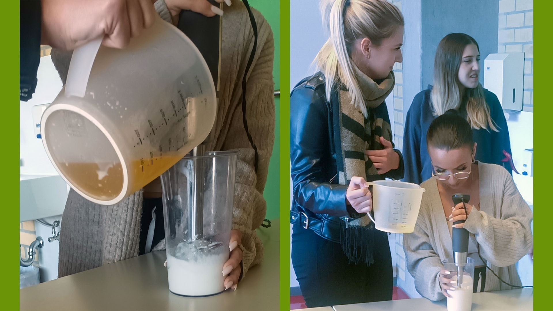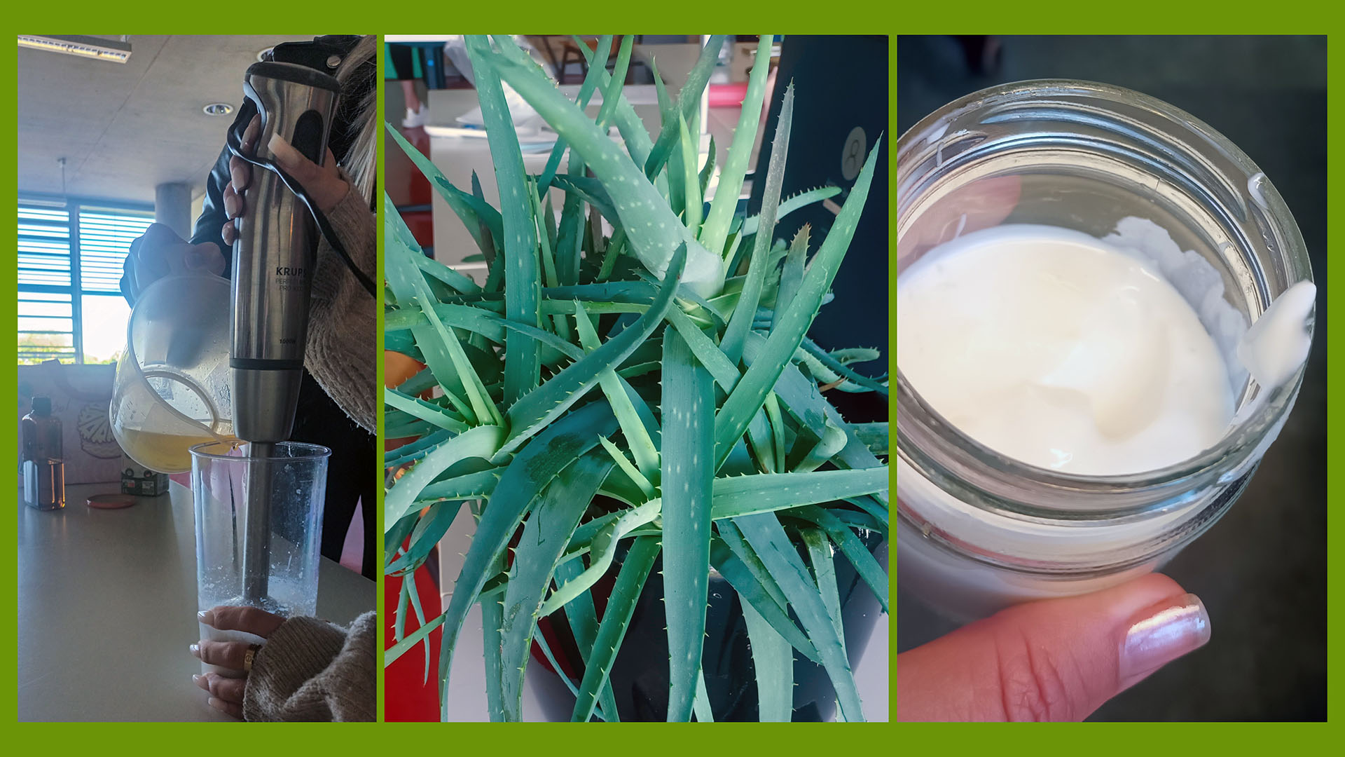 Cremes und Gele, Pflegestoffe und Wirkstoffe, Reinigung und Pflege – all das ist Inhalt des Fachs Kosmetik im Ausbildungsberuf Drogist/-in. Nach einem Jahr theoretischen Unterrichts im Fach Kosmetik sollte nun endlich das Erlernte angewendet werden. Die 2DG2 stellte eine eigene Creme aus nur vier Zutaten her: Zuerst wurde die hauseigene Aloe-vera-Pflanze fachgerecht geerntet und deren Gel extrahiert. Danach stellten die Schülerinnen und Schüler eine Öl-in-Wasser-Emulsion aus Mandelöl und handelsüblicher Milch mit Hilfe eines Rührstabs her. Nun musste nur noch der passende Duft ausgewählt werden und schon war die selbst hergestellte Creme abfüllbereit für die kleinen Tiegel. Begleitet wurde die Herstellung mit Analysen der Konsistenz und Wiederholungen des Stoffs aus dem vergangenen Lehrjahr. Es ist doch erstaunlich, wie einfach man eigene Produkte einfach und nachhaltig herstellen kann.