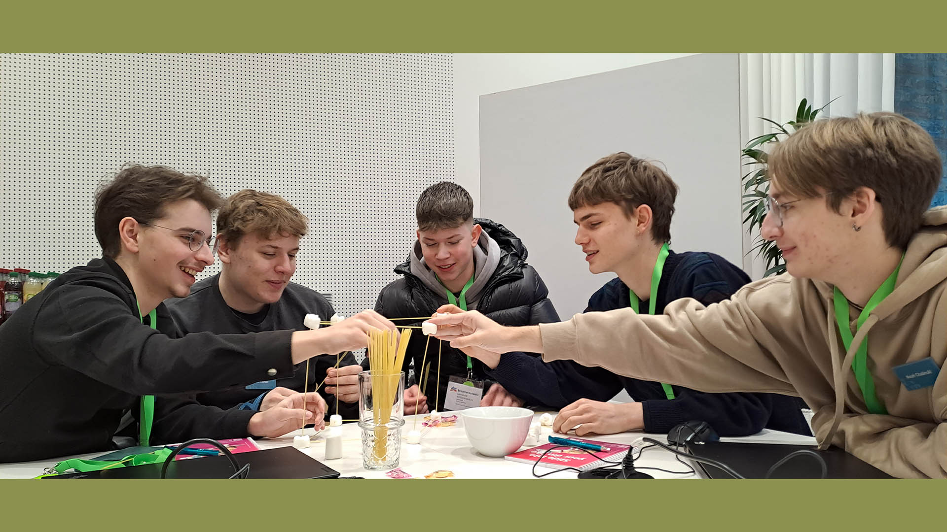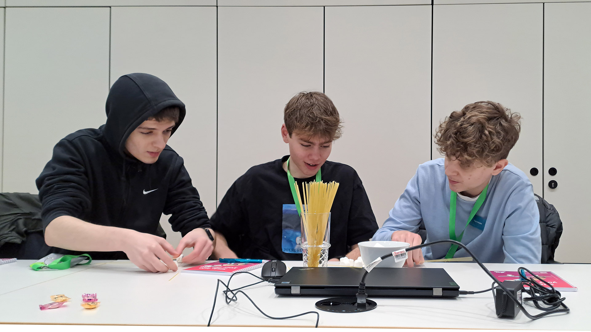 Im Laufe des Tages erhielten wir, zwischen kurzen Vorträgen, die uns über die IT-bezogenen Studiengänge an der Dualen Hochschule Karlsruhe und die sich daraus resultierenden Karrieremöglichkeiten informierten, immer wieder die Chance, mit spaßigen Spielen unsere Teamfähigkeit unter Beweis zu stellen, wie z. B. beim Bauen eines Turms mithilfe von rohen Spaghetti und Marshmallows; außerdem gab’s auch ein Quiz.