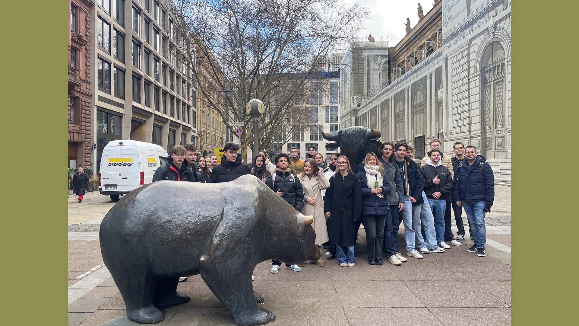 Als nächstes ging es gemeinsam zur Frankfurter Börse. Direkt vor dem Gebäude, auf dem Börsenplatz, konnte man die weltweit bekannten Börsensymbole Bulle und Bär als Skulpturen sehen. Sie stehen für das Auf und Ab im Börsenhandel. In der Börse bekamen wir anschließend einen Einblick in die Arbeit der Broker und viele weitere spannende Informationen über die Geschichte der Börse und ihre Funktionen in der Wirtschaft. Der Besuch trug zur Erweiterung des schulischen Wissens bei und gewährte viele praktische Einblicke in die Wirtschaft.