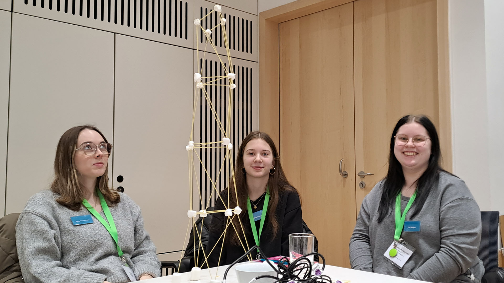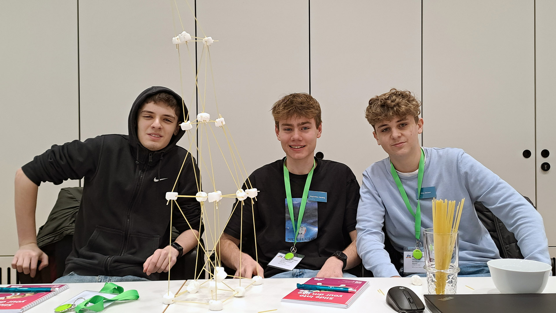 Im Laufe des Tages erhielten wir, zwischen kurzen Vorträgen, die uns über die IT-bezogenen Studiengänge an der Dualen Hochschule Karlsruhe und die sich daraus resultierenden Karrieremöglichkeiten informierten, immer wieder die Chance, mit spaßigen Spielen unsere Teamfähigkeit unter Beweis zu stellen, wie z. B. beim Bauen eines Turms mithilfe von rohen Spaghetti und Marshmallows; außerdem gab’s auch ein Quiz.